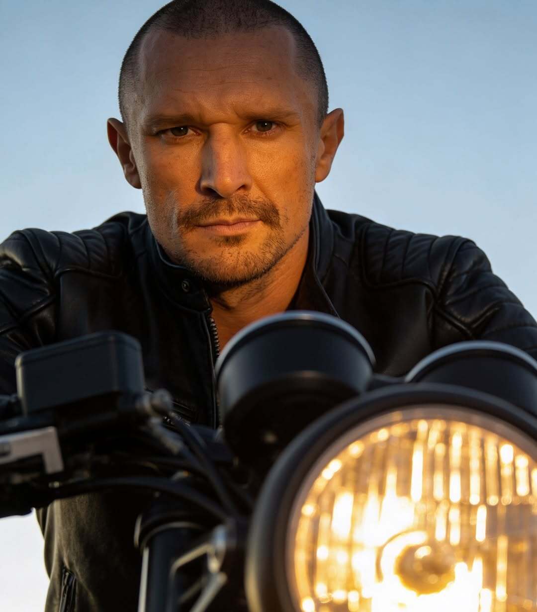 Цимбалюк позировал за рулем мотоцикла. Он предстал в черной кожаной куртке.