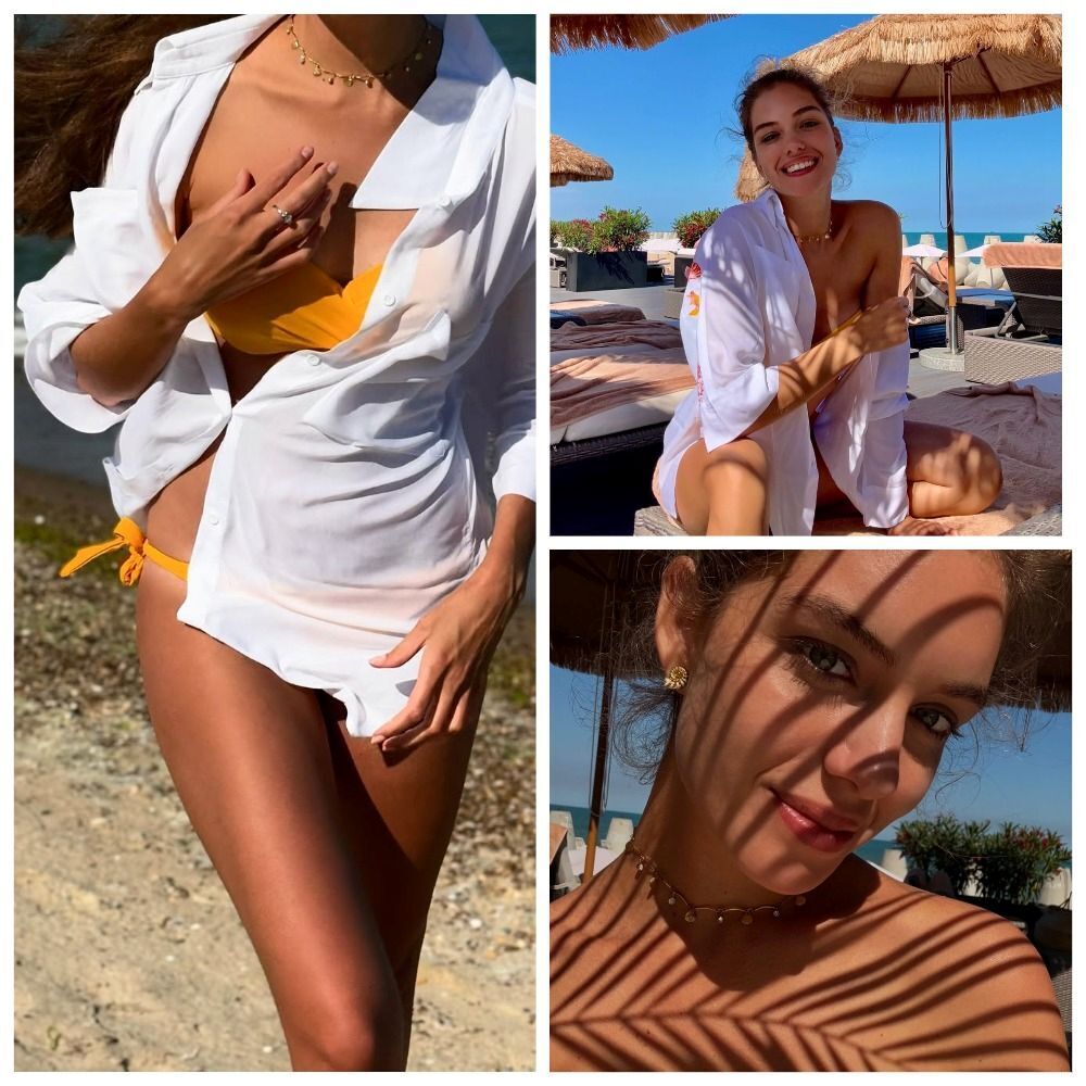 На одном из фото модель запечатлена в полный рост, но без головы, демонстрируя в кадре невероятно стройную фигуру и загар.