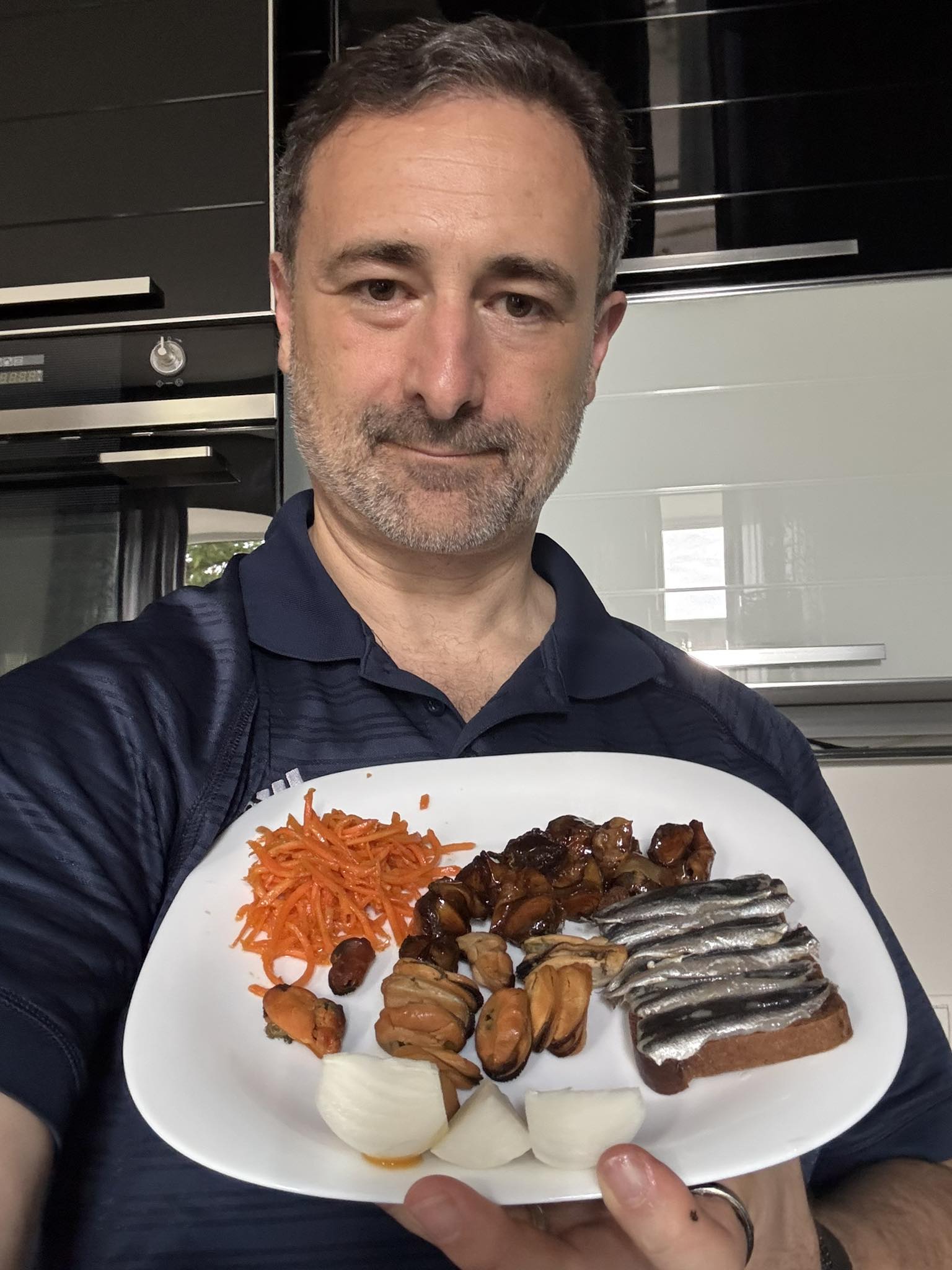 "Продолжаю кулинарные выходные. В прошлый раз спрашивали, что еще можно есть с тюлькой. С тюлькой можно есть все – на этот раз рапаны, мидии и морковь по-корейски с молодым луком", – сообщил он.