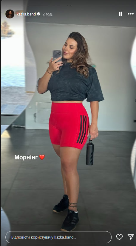 Солистка украинской группы Kazka Александра Зарицкая 18 февраля разместила в Instagram Stories селфи, на котором запечатлена в шортах и короткой футболках во время тренировки.