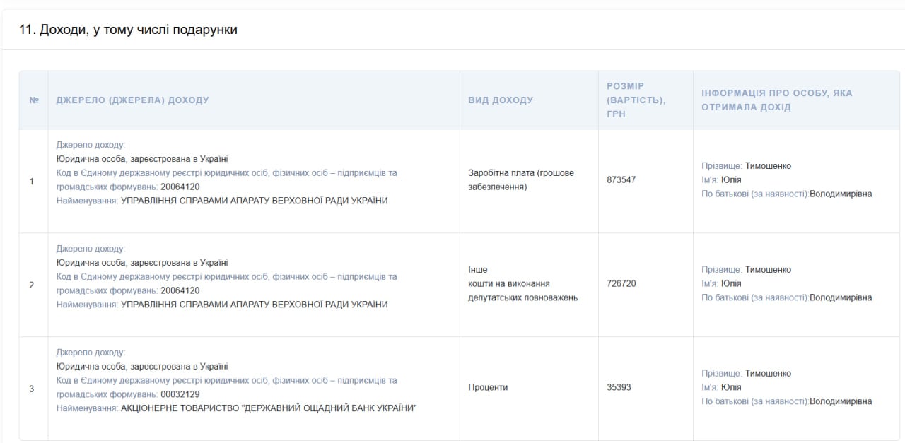 Таким образом, в месяц Тимошенко зарабатывала в среднем 72 795 грн. Кроме того, в прошлом году она получила 726 720 грн на исполнение депутатских полномочий.