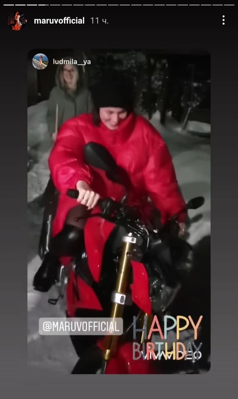 Строящая карьеру в РФ украинская певица Maruv на 30-летие получила в подарок от супруга Александра Корсуна автомобиль и мотоцикл. Об этом она рассказала 16 февраля в Instagram Stories.