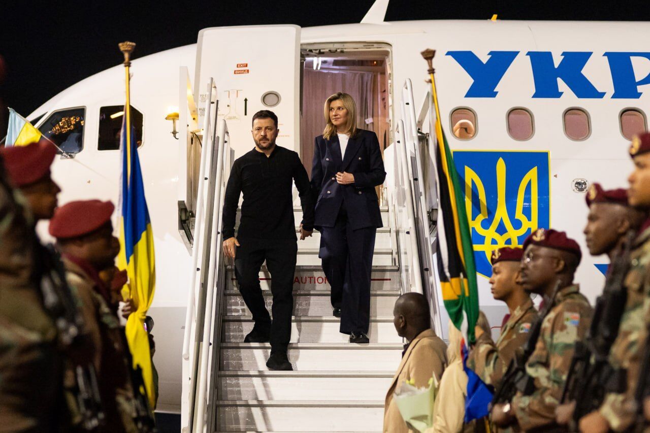На фото супруги Зеленские зафиксированы в момент спуска с трапа самолета. Первая леди выбрала для визита белую блузку и темно-синий костюм. Президент Украины прибыл в ЮАР в черных брюках и джемпере.