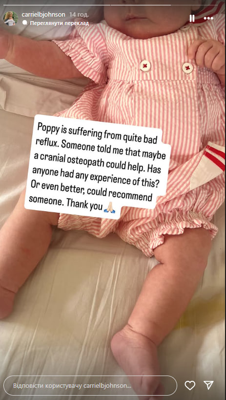 "Поппи страдает от довольно сильного рефлюкса. Кто-то сказал мне, что, возможно, краниальный остеопат мог бы помочь. У кого-нибудь был такой опыт? Или, что еще лучше, мог бы порекомендовать кого-нибудь. Спасибо", – обратилась она к подписчикам.
