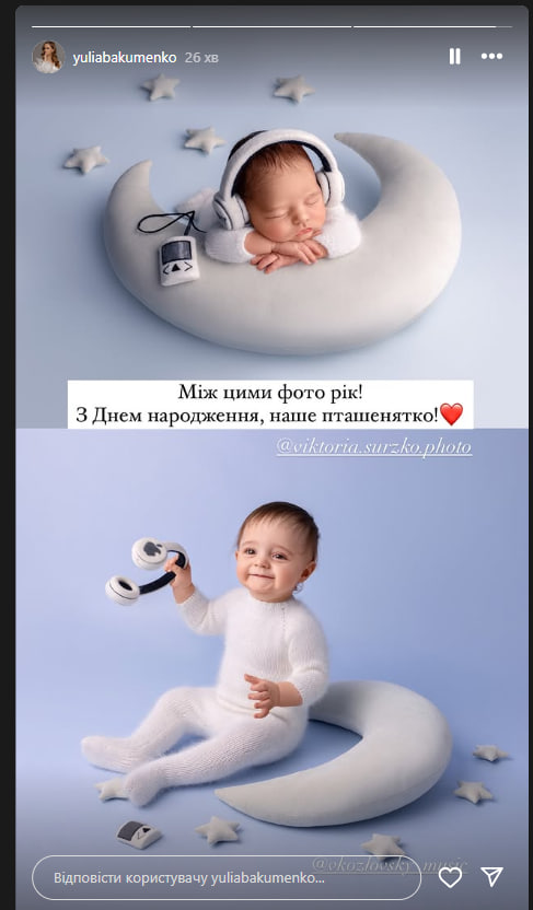 Жена украинского артиста Виталия Козловского, украинская пиарщица Юлия Бакуменко 25 февраля разместила в Instagram Stories коллаж, посвященный первому дню рождения их сына Оскара.