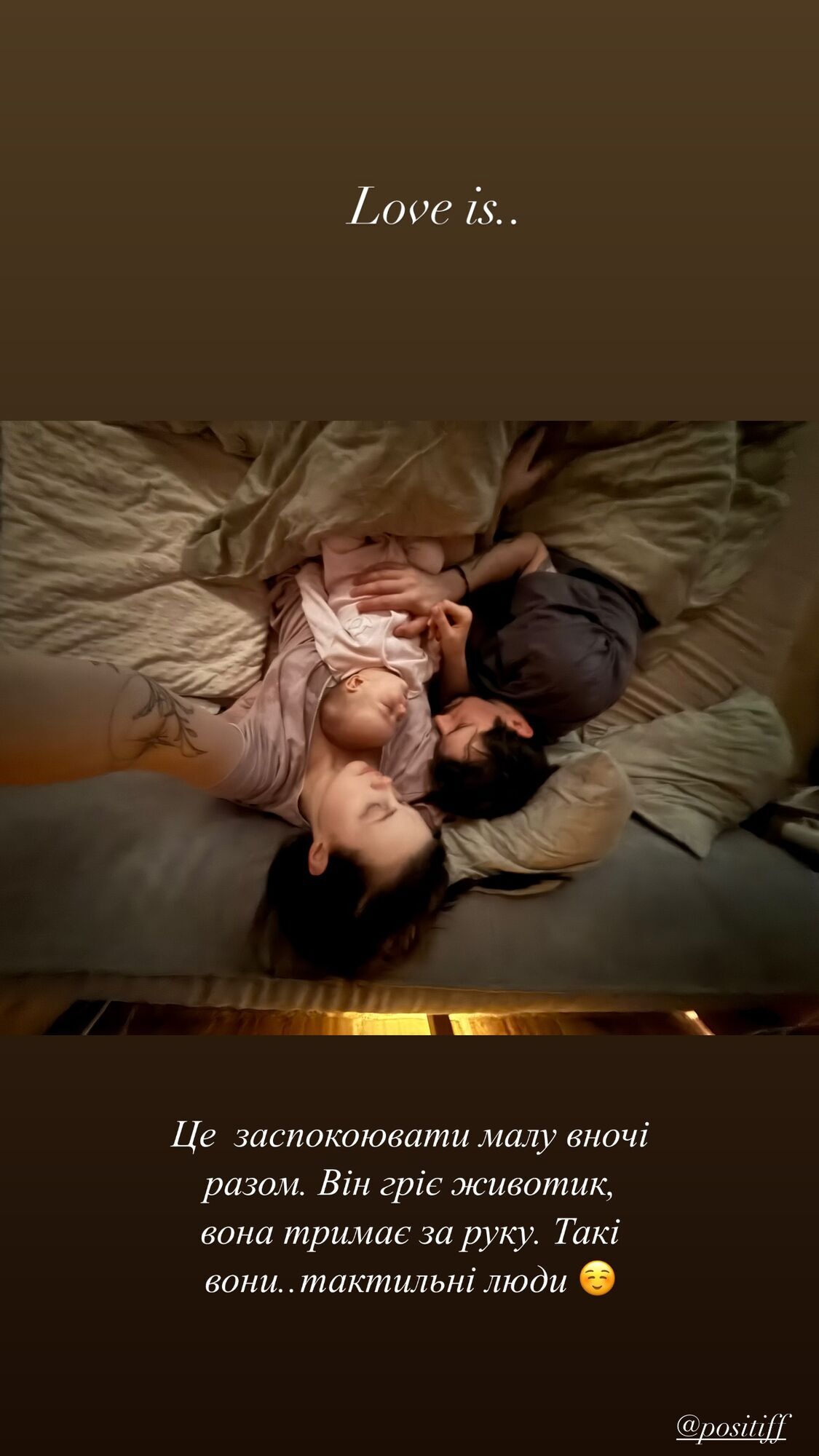 "Любовь – это успокаивать малую ночью вместе. Он греет животик, она держит за руку. Такие они. Тактильные люди", – подписала фото жена артиста.