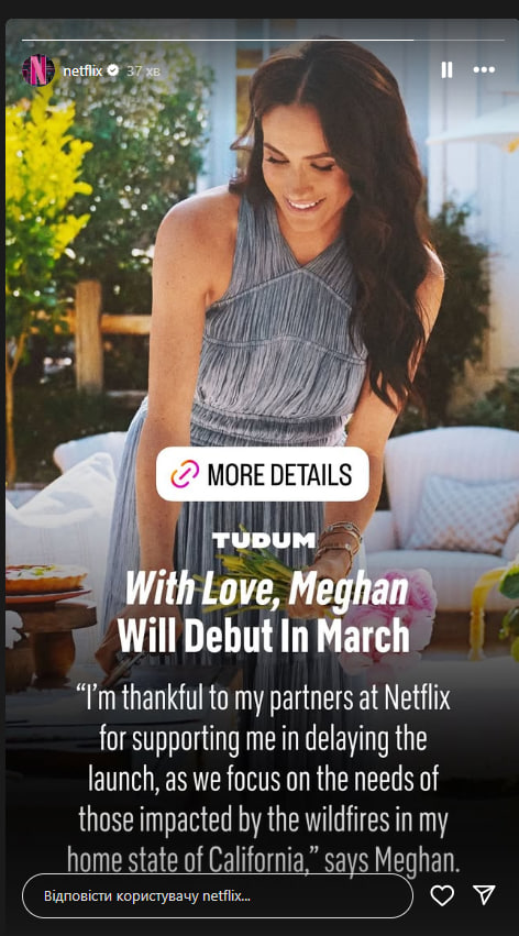 "Я благодарна своим партнерам из Netflix за поддержку в отсрочке запуска, поскольку мы сосредоточены на нуждах тех, кто пострадал от лесных пожаров в моем родном штате Калифорния", – говорится в заявлении герцогини Сассекской.