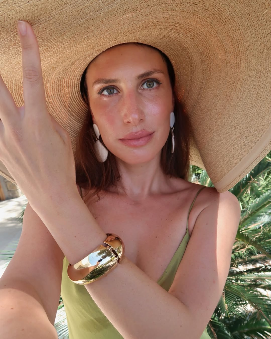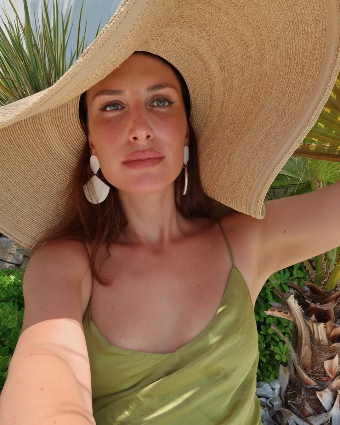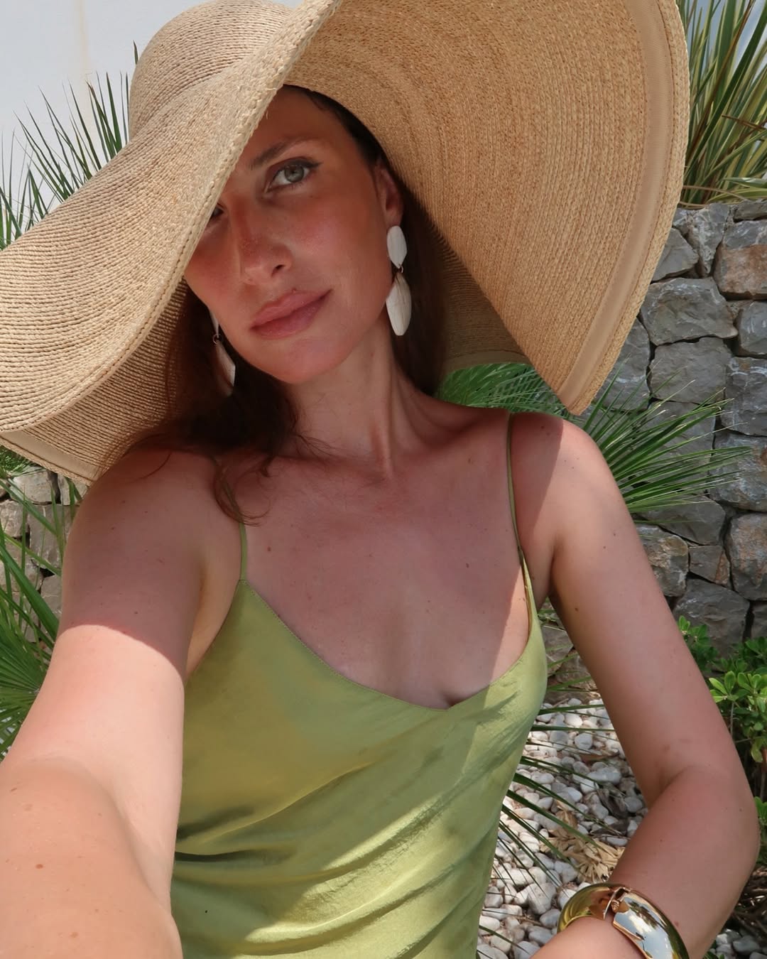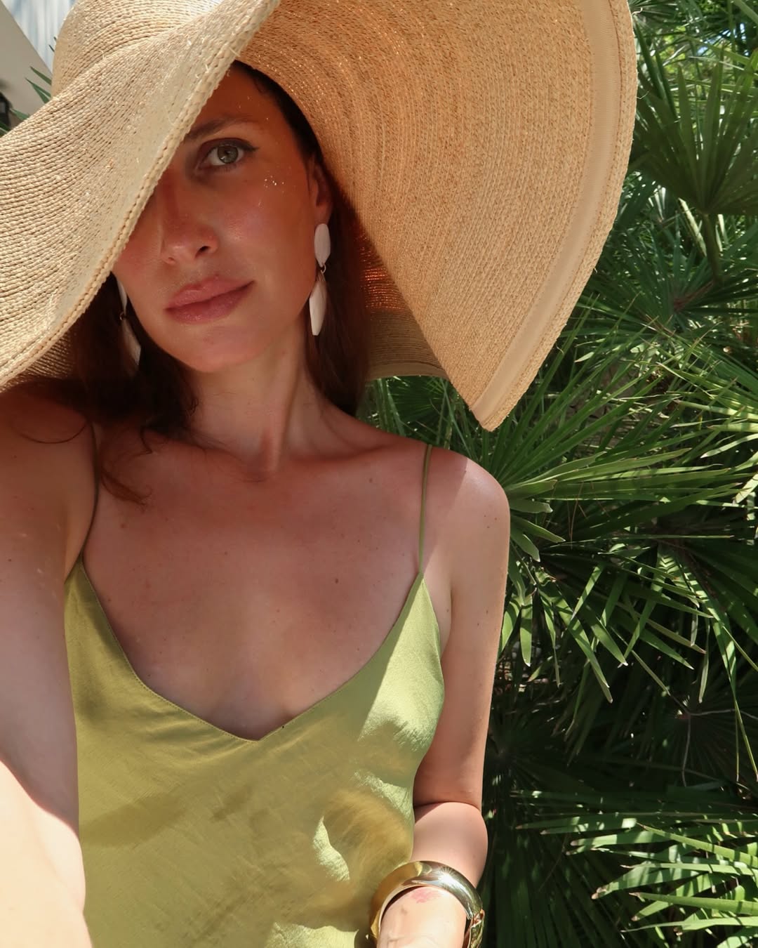 Зиневич снялась в шляпе с широкими полями, без декоративной косметики на лице. Она надела платье-комбинацию оливкового цвета. Образ дополнила массивными украшениями: серьгами и браслетом, а также бежевыми мюли с цветами.