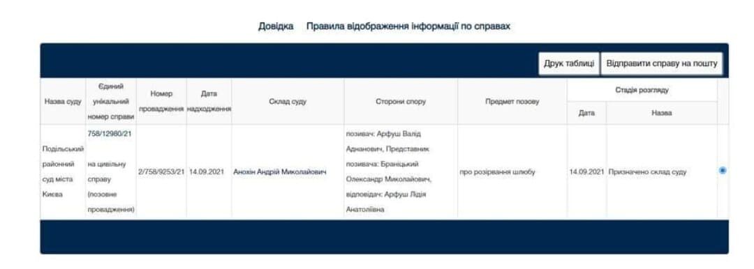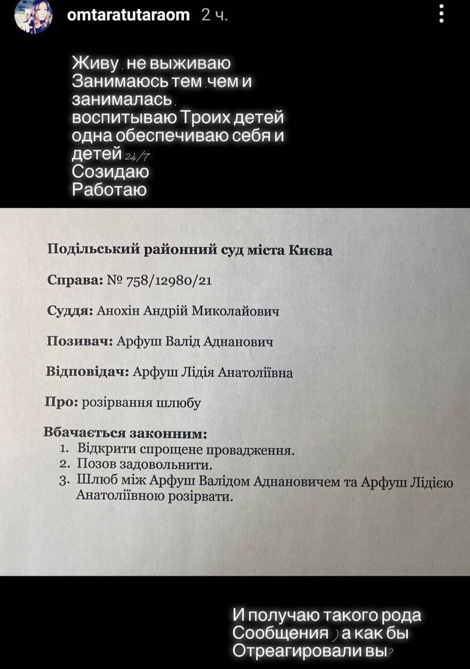 В уведомлении указано, что по факту искового заявления было открыто производство №758/12980/21. На официальном портале, где публикуется Единый реестр судебных решений, по номеру этого производства указано, что иск был подан Арфушем 14 сентября. Решение суда о разводе пока что не опубликовано.
