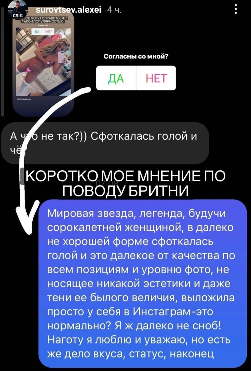 Украинский актер и стриптизер Алексей Суровцев 9 января в Instagram Stories раскритиковал последние публикации в Instagram американской певицы Бритни Спирс, на которых она запечатлена голой.