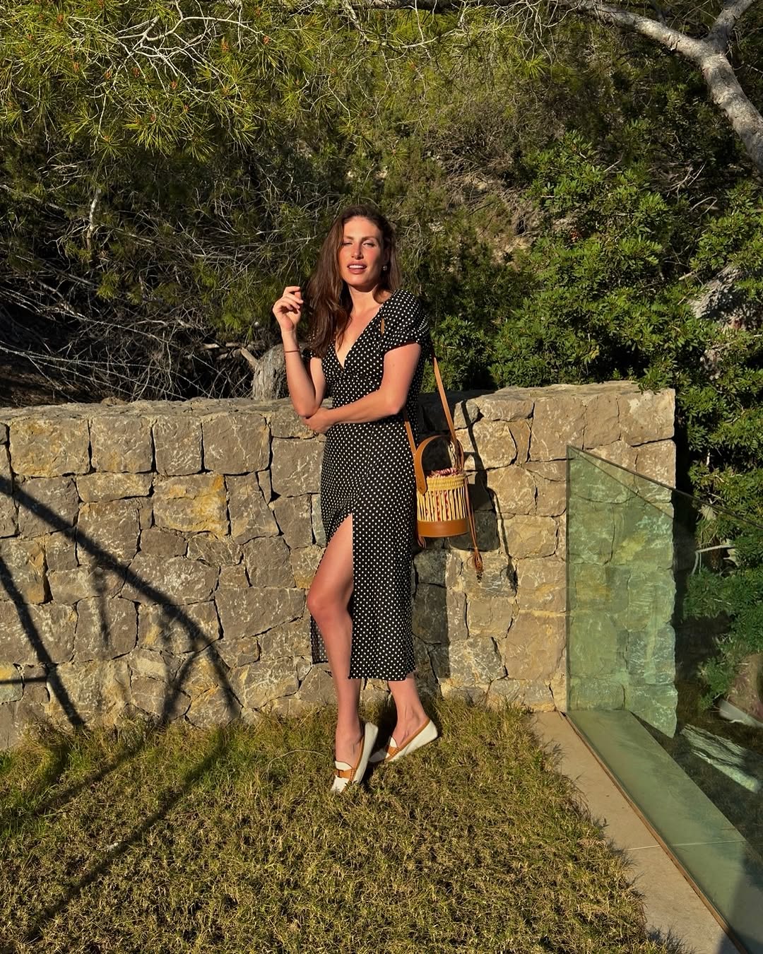 Зиневич предстала в черном платье в белый горошек. Она выбрала фасон на запах, с боковым разрезом. Образ бизнесвумен дополнила обувью и сумкой в бежево-коричневых тонах.