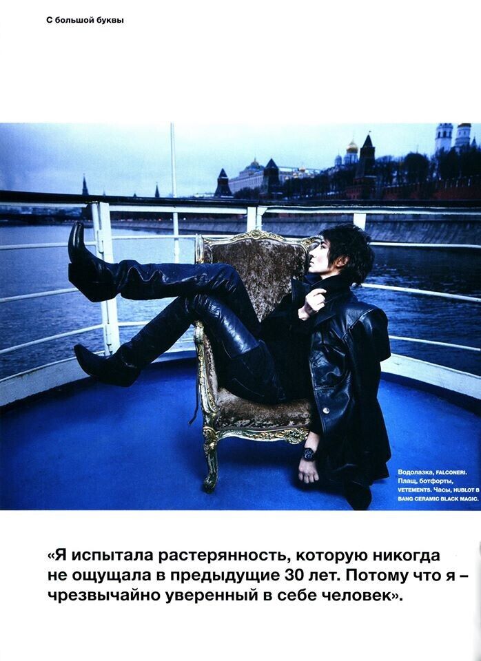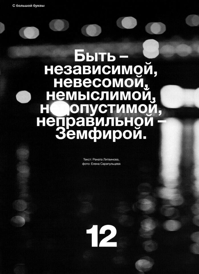 Певица Земфира приняла участие в фотосессии для глянцевого журнала Numero. Стиль создала подруга певицы, сценарист, режиссер и актриса Рената Литвинова, ставшая креативным директором издания. Также Литвинова взяла интервью у Земфиры, в котором та рассказала о своей первой любви и о потере близких людей.
