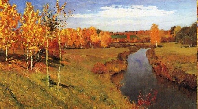 В 1895 году он написал картину "Золотая осень". Это одно из наиболее известных произведений художника. Цветовая гамма картины представляет самые яркие краски осени: желтую и красную листву, холодную уже речку, в которое отражаются еще яркие облака, вдали – деревенские домики, манящие уютом.