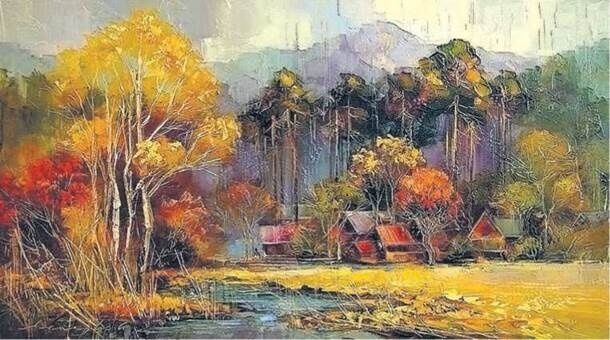 Излюбленный жанр Манайло – пейзажи. Картина "Золотая осень" изображает карпатское село – с деревянными домиками, горным пейзажем и прохладным ручьем.