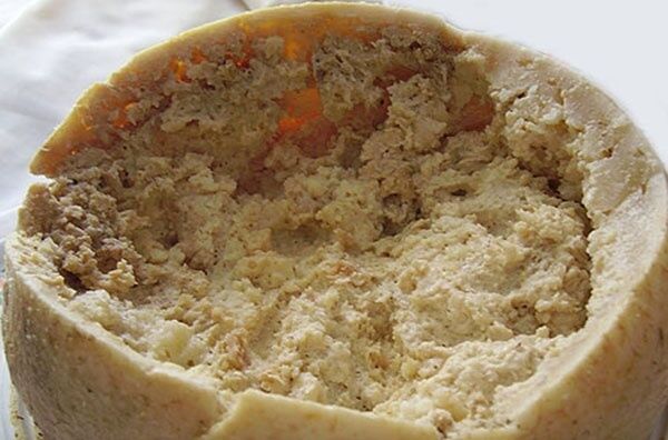 Аутентичное название этого блюда casu marzu переводится как "гнилой сыр". В твердый сыр добавляют личинки сырной мухи и выдерживают дольше обычного. Маленькие червячки ускоряют процесс распада жиров, и сыр становится мягким.