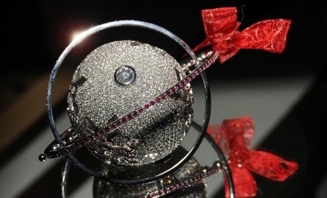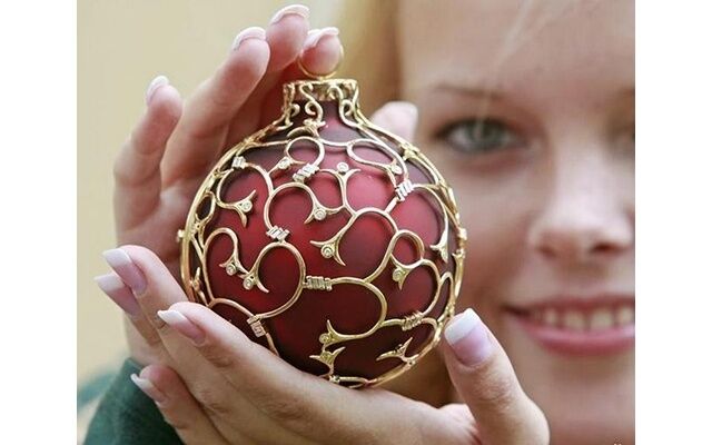 Одно из самых дорогих украшений в мире – ярко-красный стеклянный шар, помещенный в ажурную сетку из золота и 120 бриллиантов, общая масса которых составляет 5,1 каратов.