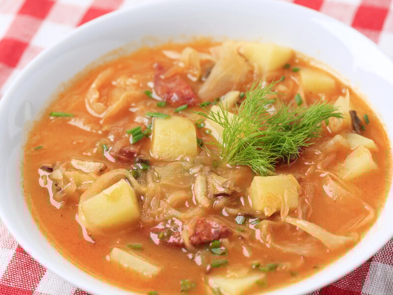 - Добавьте картофель, квашеную капусту и томатное пюре. Варите до готовности картофеля. Добавьте фасоль и доведите по вкусу. Дайте настояться 30 минут.