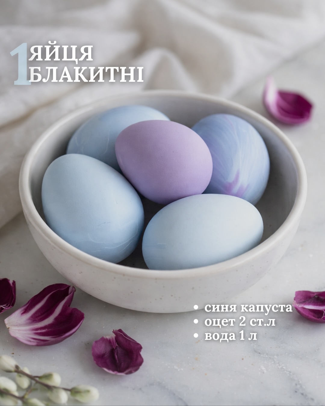 Чтобы получить голубые яйца, понадобится синяя капуста, две столовых ложки уксуса и 1 л воды.