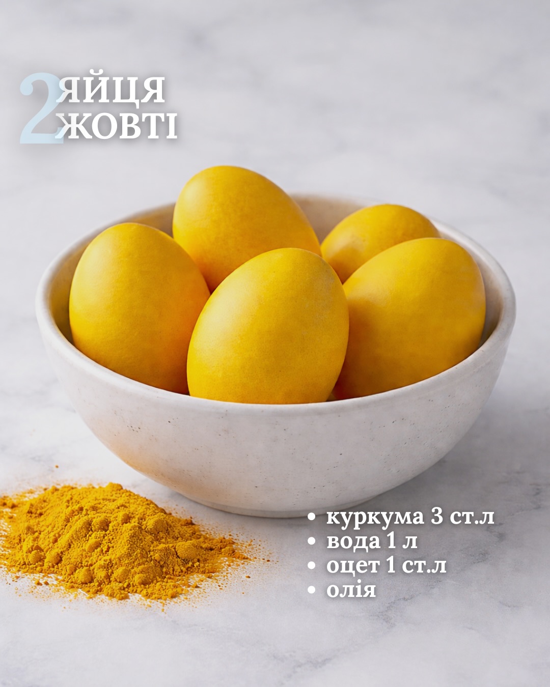 Желтые крашенки выйдут, если подержать яйца в настое из 1 л воды, трех столовых ложек куркумы, одной столовой ложки уксуса. Для блеска яиц понадобится также растительное масло.