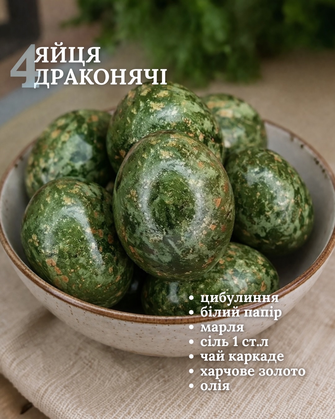 Чтобы получить зеленые яйца с оригинальным принтом, понадобится луковая шелуха, белая бумага, марля, соль, чай каркаде и пищевое золото.