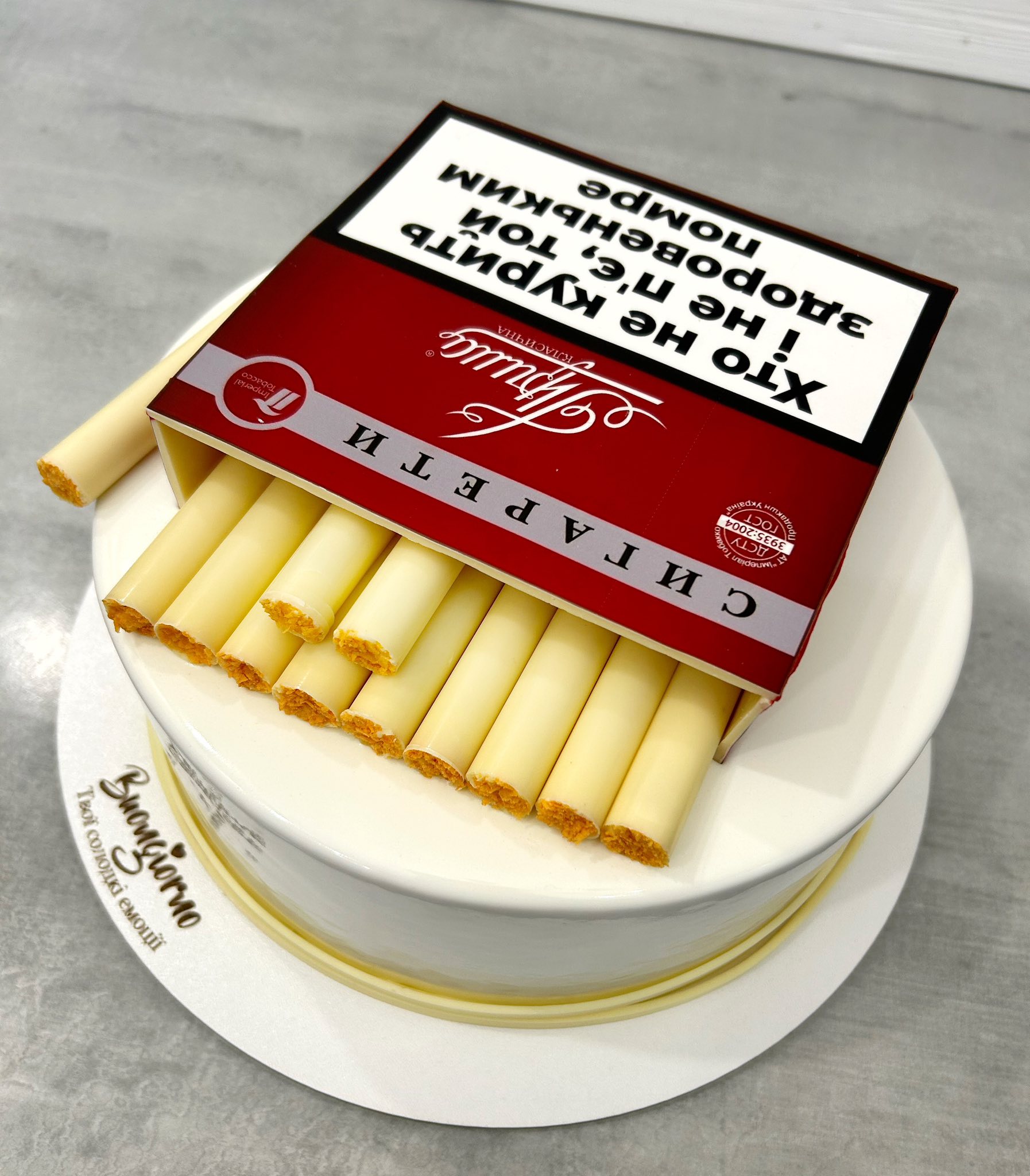 "Юбиляр троллит своих детей и внуков в ответ на их просьбу бросить курить, мол, кто не курит и не пьет, тот здоровеньким умрет. Ну а дети и внуки в долгу не остались и к юбилею дедушки заказали такой торт с его коронной фразой, – описала новый шедевр кондитер. – Внутри – кофе, вишня, карамель с шоколадными бисквитами, декор – бельгийский шоколад".