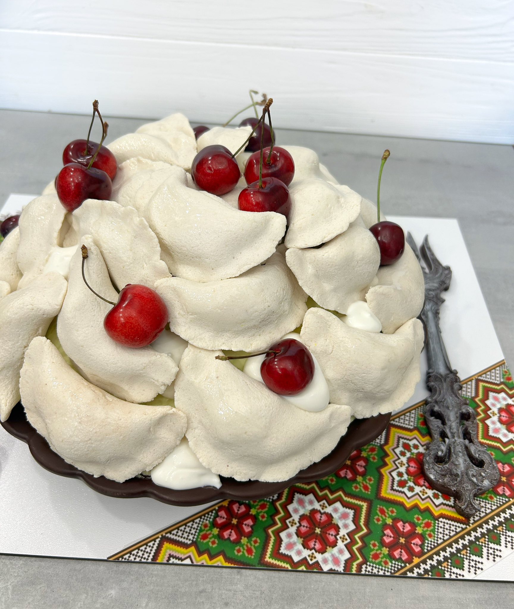 "Получила безумное удовольствие от создания этого сладкого сюрприза. Мисочка и вилка – черный шоколад, внутри торт с фисташковым муссом и начинками, вареники – из марципана с вишневой и шоколадной начинками", – рассказала Магера.
