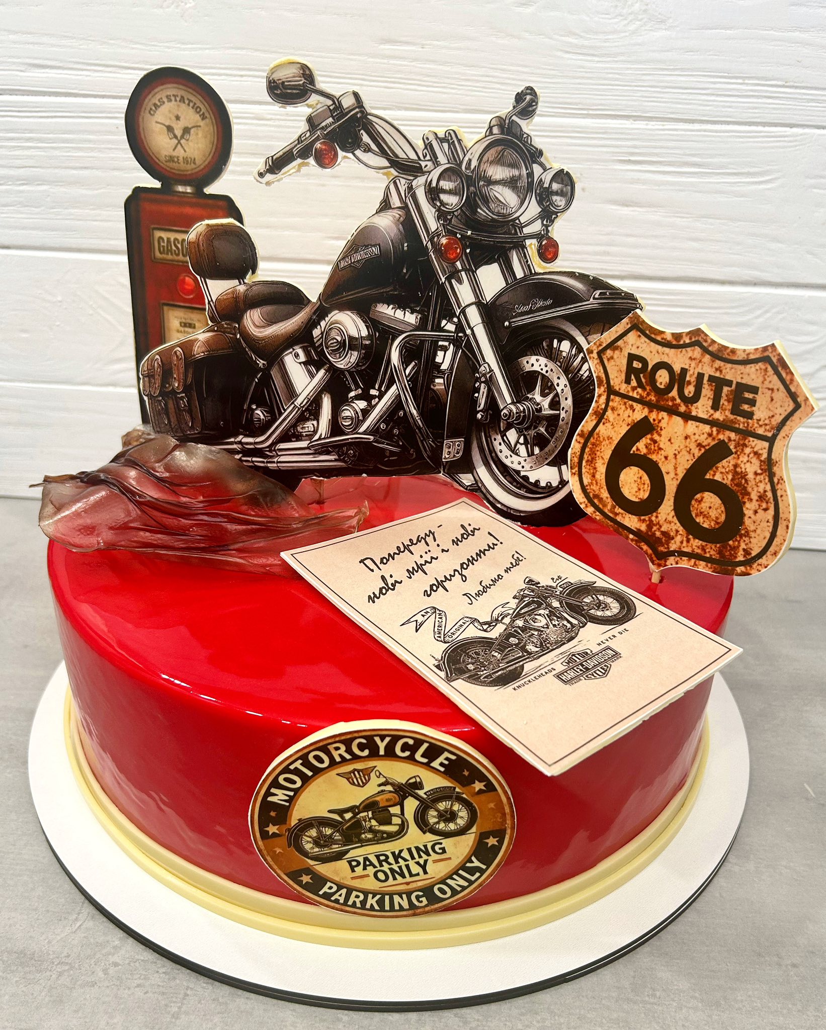 "Внутри – клубника с земляникой, манго, абрикос, персик, фисташковый мусс и маково-кокосовые бисквиты. Вкусно, ярко, по-летнему, – описала десерт кондитер. – Harley пока из шоколада, что тоже неплохо. Поздравления я сделала в стиле винтажного американского постера".