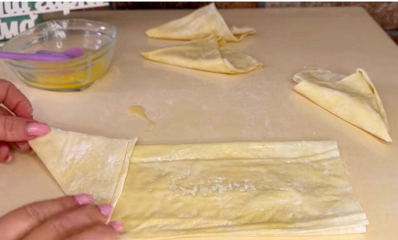 - Растопите сливочное масло и смажьте им листы теста с двух сторон. Из каждого листа сформируйте конус, сложив тесто в несколько раз треугольником и подвернув концы. Внутрь каждой трубочки поместите кондитерскую бумагу, чтобы во время выпекания трубочка не потеряла форму.