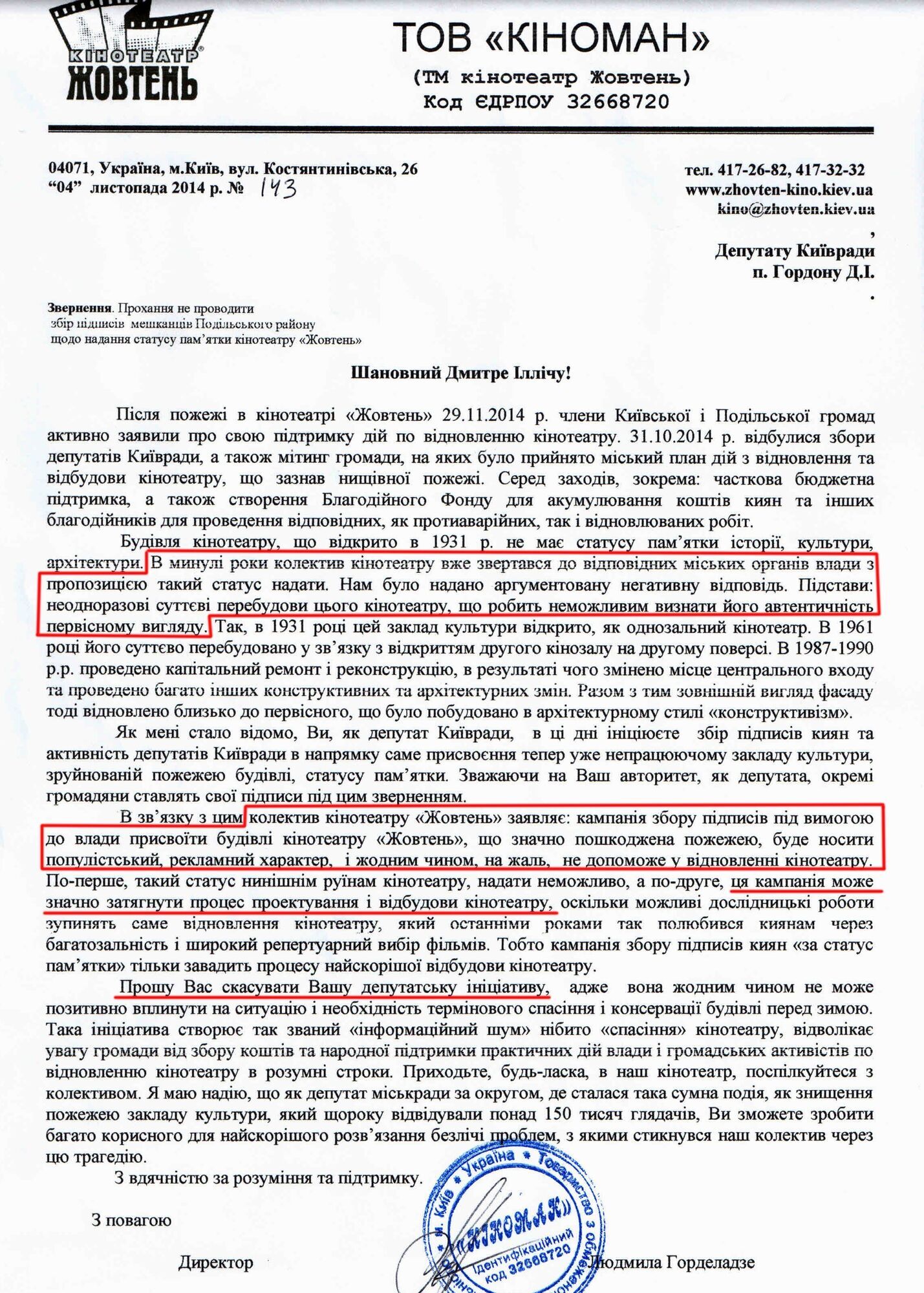 On November 12, 2014, at the session of Kyiv Council I put forward a bill on the awarding of the status of a local landmark of architecture to Zhovten and the status of a public garden to the area around the cinema. Several hours later, Gordeladze published a post on her Facebook page accusing me of an attempted raid, complicity in the arson, and “the desire to take away the cinema 12 years before”.