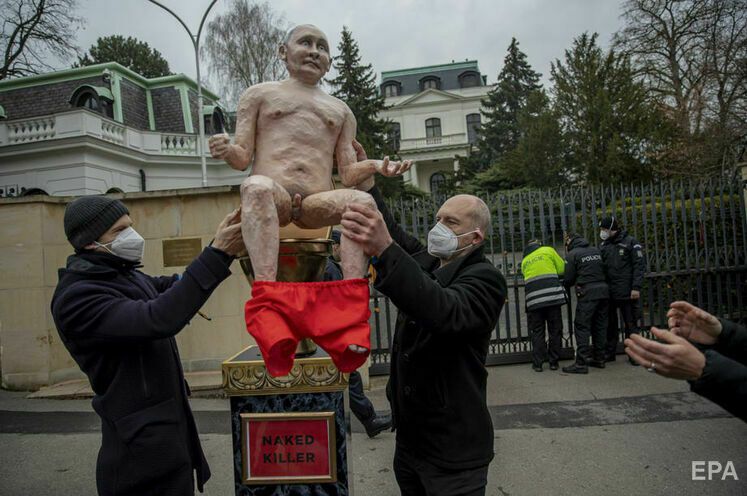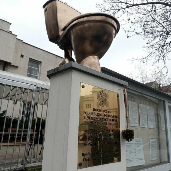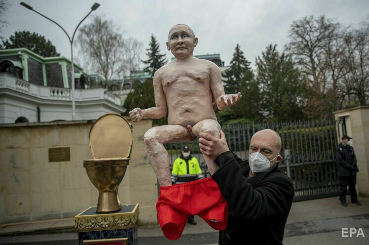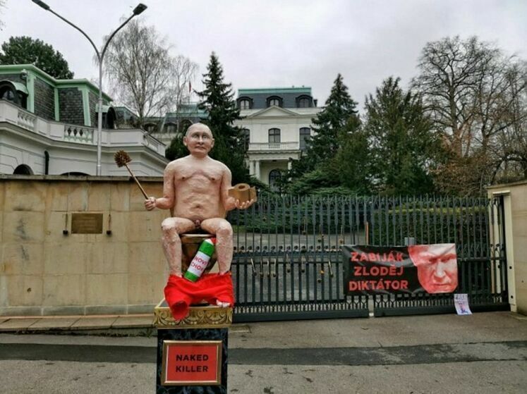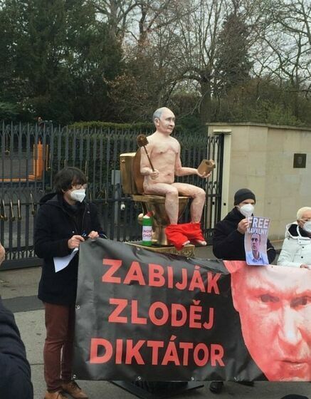 In front of Russian embassy in Czech Republic, activists installed a statue of naked Putin on golden toilet