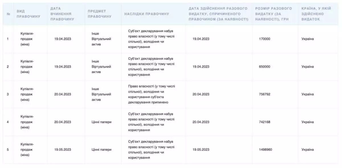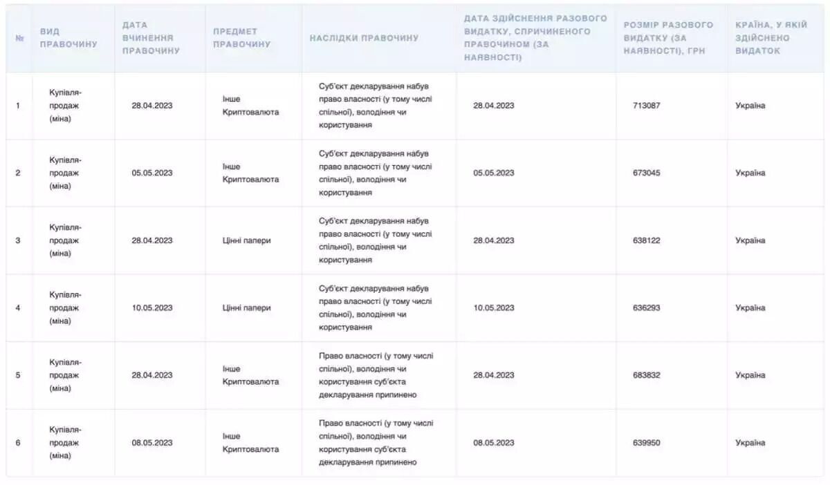 "According to the declaration, Braverman purchased crypto worth UAH 1.39 million, and sold it for UAH 1.32 million. It is very similar to the legalization of corruption funds: funds were first allegedly deposited into a non-existent wallet (no one can trace it), and then withdrawn – to a card, for example. This is how more than UAH 1 million appeared out of nowhere. In addition, Braverman bought securities worth more than UAH 1 million 270 thousand during the year. That is, a person with a civil servant’s salary without blinking an eye bought virtual assets worth UAH 2.5 million", – the agency wrote.