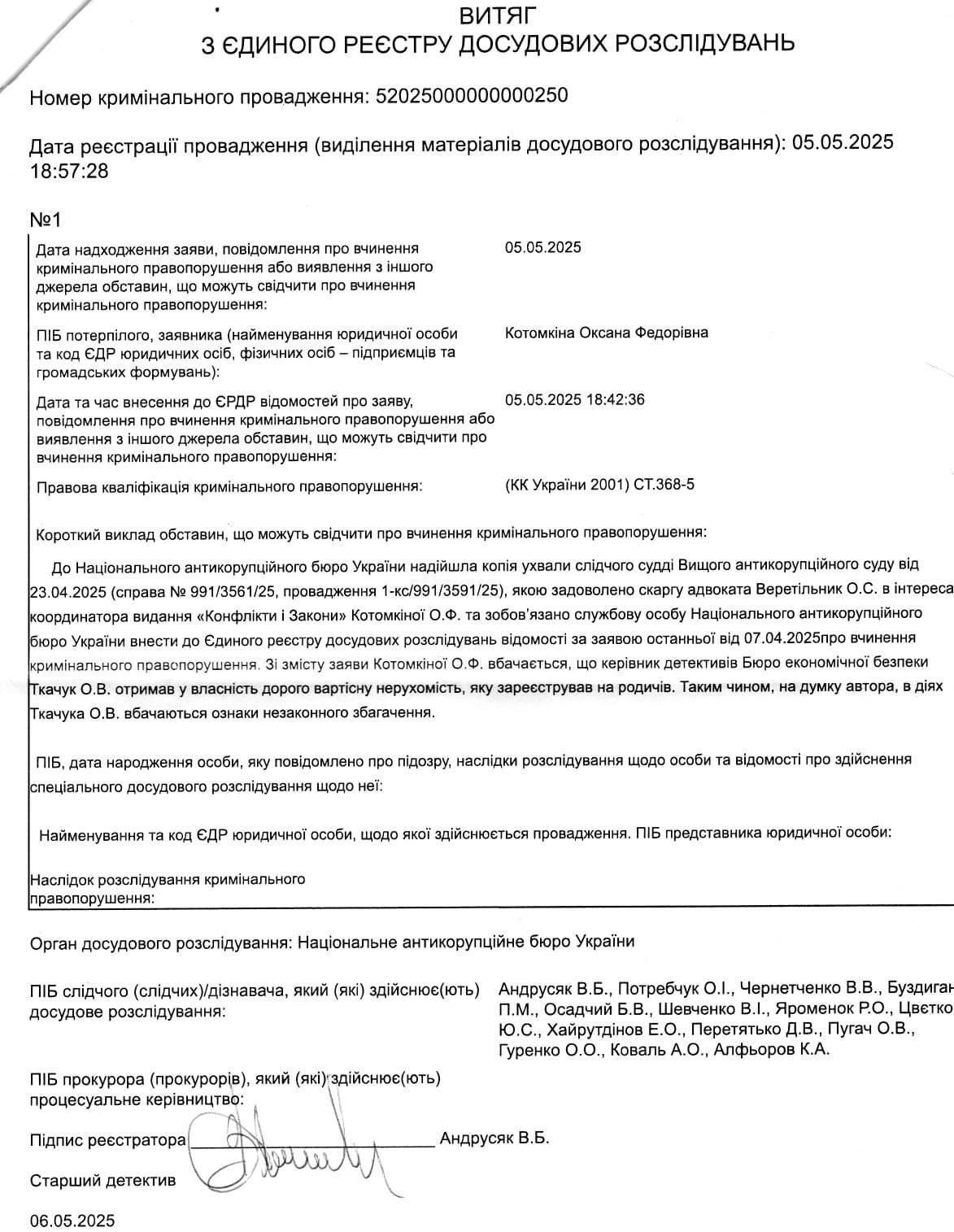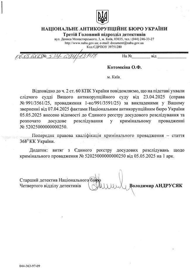 In April 2025, Oksana Kotomkina, coordinator of the legal publication "Conflicts and Laws", filed a complaint with the High Anti-Corruption Court over NABU’s alleged inaction, the outlet reported. The court accepted the applicant’s arguments and ruled that NABU must investigate signs of a potential offence in Tkachuk’s actions as part of a pre-trial investigation.