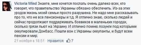 Victoria Wind: "You know, I want to send to hell all those who say that the Ukrainian government must provide everyone. The life of my family is simply ruined because of these morons. Do not tell me that not all of them are pensioners and so on. I know perfectly well how many people continue supporting terrorists in small towns, how much mud is thrown at Ukraine. I remember mottos they used when occupying Donbass. Go away from Ukraine, occupants, and everyone will have pensions and peace".