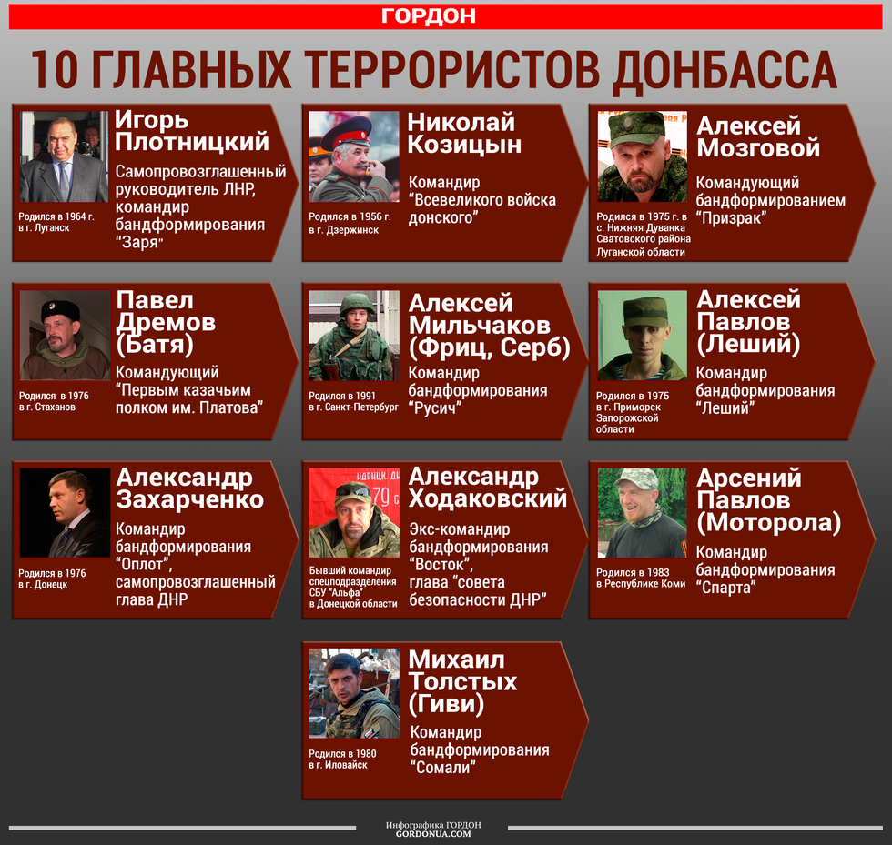"ГОРДОН" присмотрелся к главным террористам востока Украины и сделал поименный список самых активных из них. Подробнее читайте в нашем спецпроекте – Досье на 10 главных террористов Донбасса.