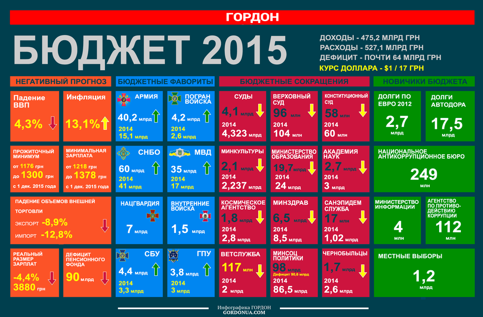 На что пойдут основные средства бюджета Украины-2015, принятого Верховной Радой бессонной ночью 29 декабря; что конкретно означает увеличение финансирования армии и силовых ведомств в три раза, насколько Ветслужба и Санэпидемслужба потеряли финансирование, по сравнению с другими, и какие новые траты правительство заложило в бюджет с рекордным дефицитом (почти 64 млрд грн) – в инфографике "ГОРДОН".