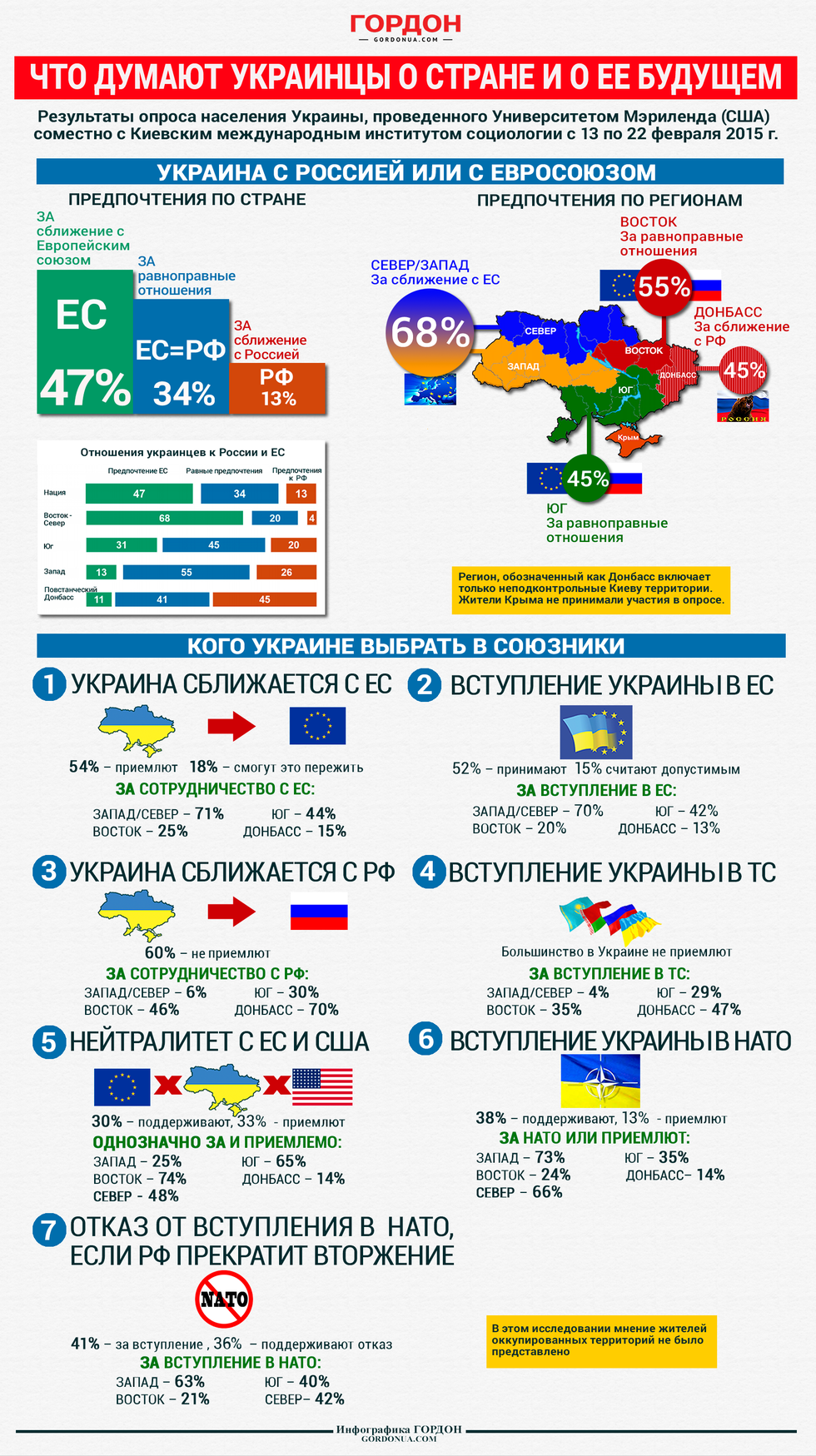 "ГОРДОН" представляет сборную инфографику по результатам опроса жителей Украины, проведенного Университетом Мэриленда в сотрудничестве с Киевским международным институтом социологии. Подробнее об опросе читайте в материале: