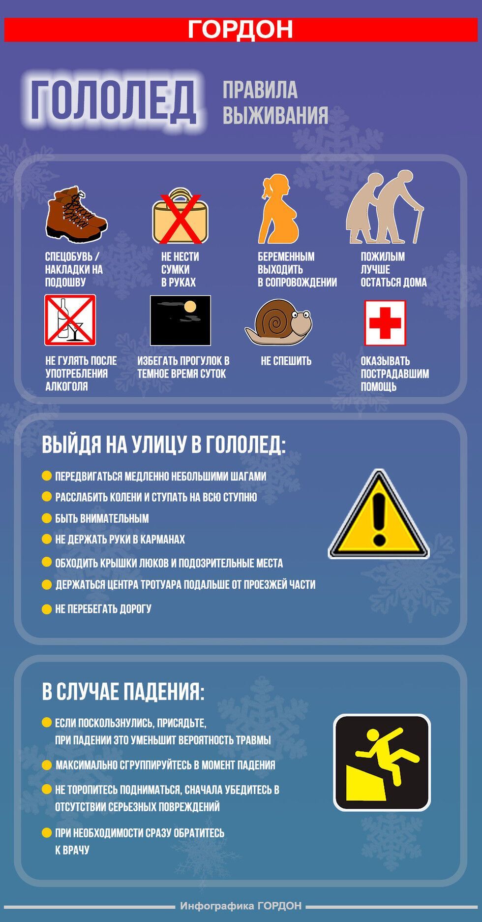 В связи с волной холодов, приходом снежной и морозной погоды издание "ГОРДОН" визуализировало основные рекомендации МЧС по поведению во время гололеда на улице. Памятка поможет избежать травм и предупредить возможные инциденты.