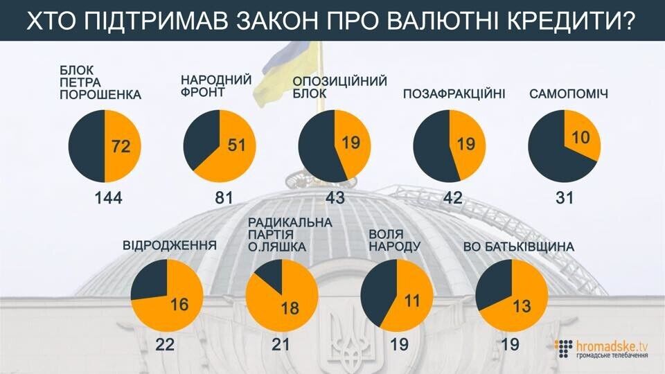На вечернем заседании в четверг, 2 июля, Верховная Рада Украины 229 голосами поддержала закон о реструктуризации валютных кредитов. "За" проголосовали депутаты, представляющие все фракции и группы парламента, и внефракционные парламентарии, но позже шесть из них отозвали свои голоса. Впрочем в регламентном комитете объяснили, что процедура отзыва голосов законодательством не предусмотрена. Согласно документу, задолженность по кредиту конвертируется по официальному курсу Национального банка Украины на момент заключения кредитного договора, а курсовая разница списывается банками. Принятие закона вызвало критику НБУ, Министерства финансов и Министерства экономики. По прогнозам Блока Петра Порошенко, этот документ будет проголосован в парламенте еще раз.