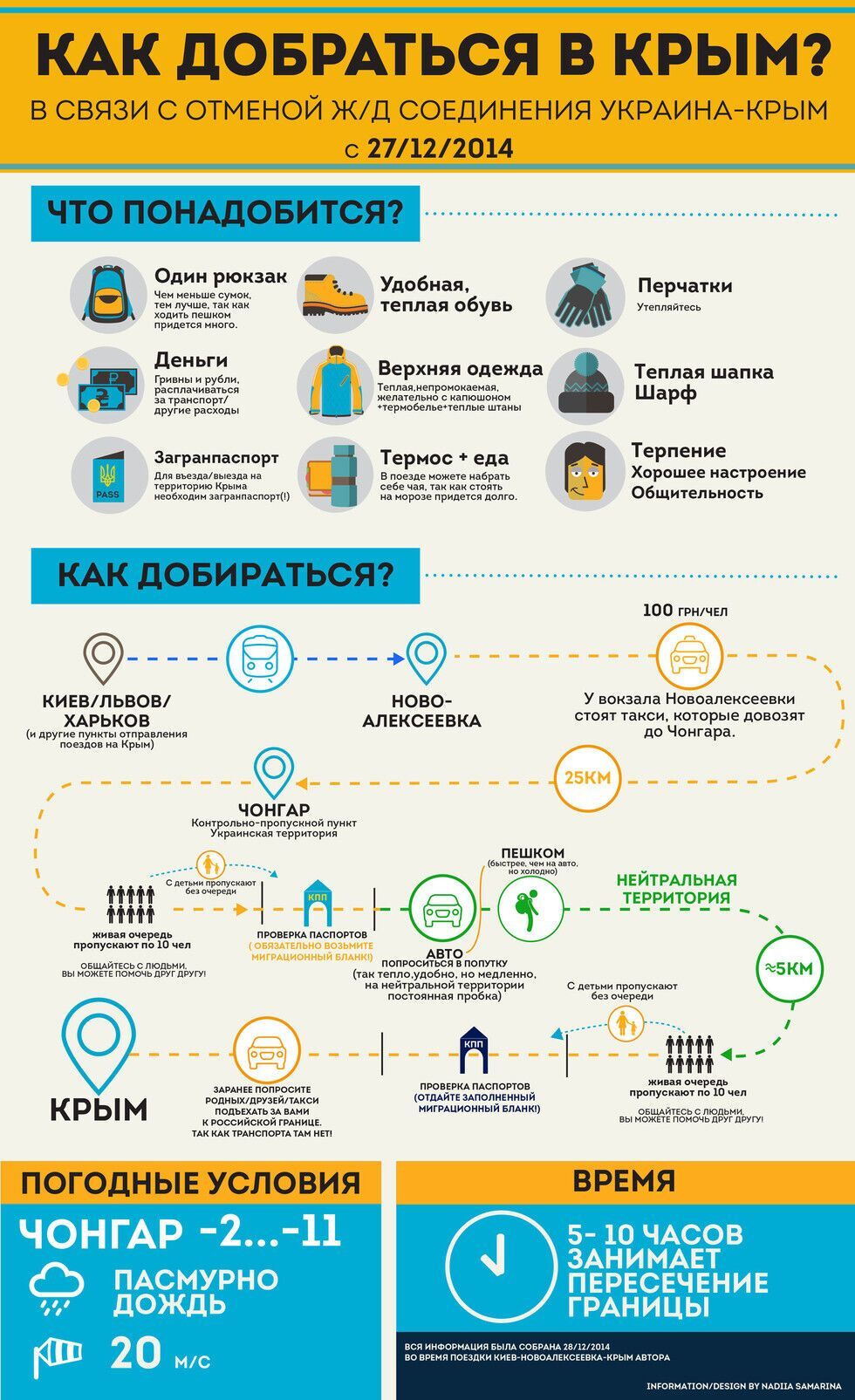 Сотни украинцев и крымчан, в связи с отменой транспортного сообщения с полуостровом, не знают, как добраться домой или в гости к родственникам. Лично отстояв 10 часов на границе, киевский дизайнер Надя Самарина создала инфографику, чтобы помочь всем, кому предстоит этот нелегкий путь в Крым.