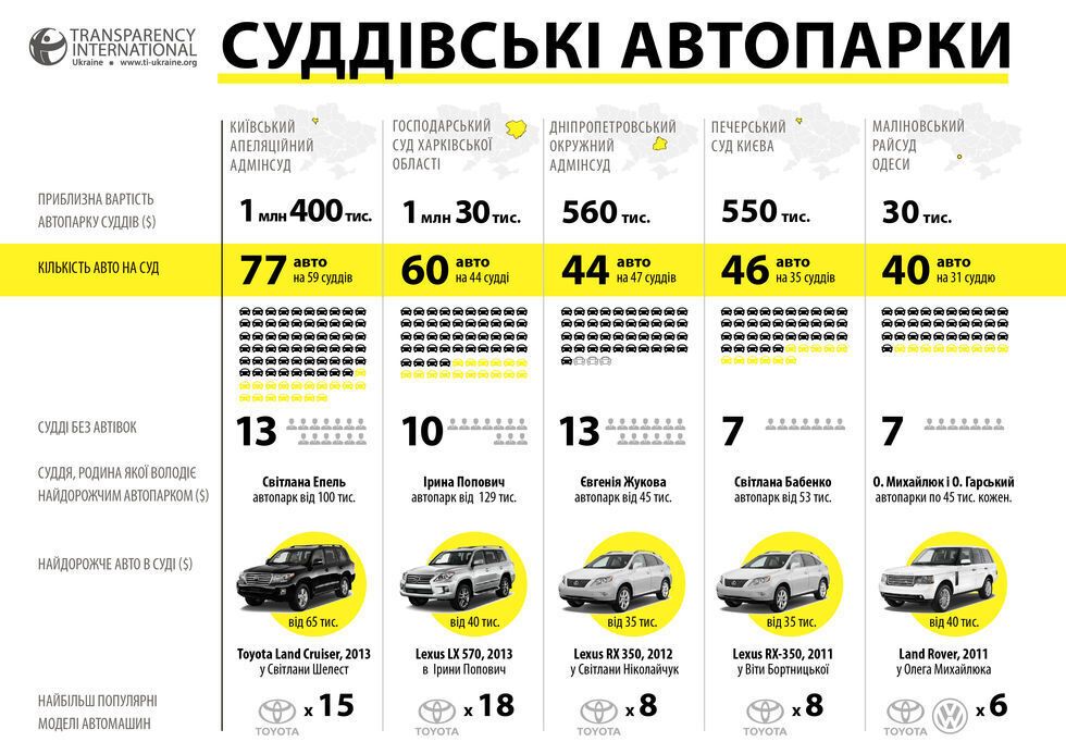 Антикоррупционная организация "Transparency International Украина" и сайт о судебных спорах "Первая инстанция" проанализировали декларации за 2015 года судей пяти украинских судов и пришли к выводу, что многие из них владеют автомобилями, стоимость которых на вторичном рынке стартует от $30–80 тыс. Исследованы автопарки Киевского апелляционного админсуда, Хозяйственного суда Харьковской области, Днепропетровского окружного админсуда, Печерского райсуда Киева и Малиновского райсуда Одессы. Общая стоимость автомобилей, которыми владеют судьи пяти указанных судов – более $3,5 млн.