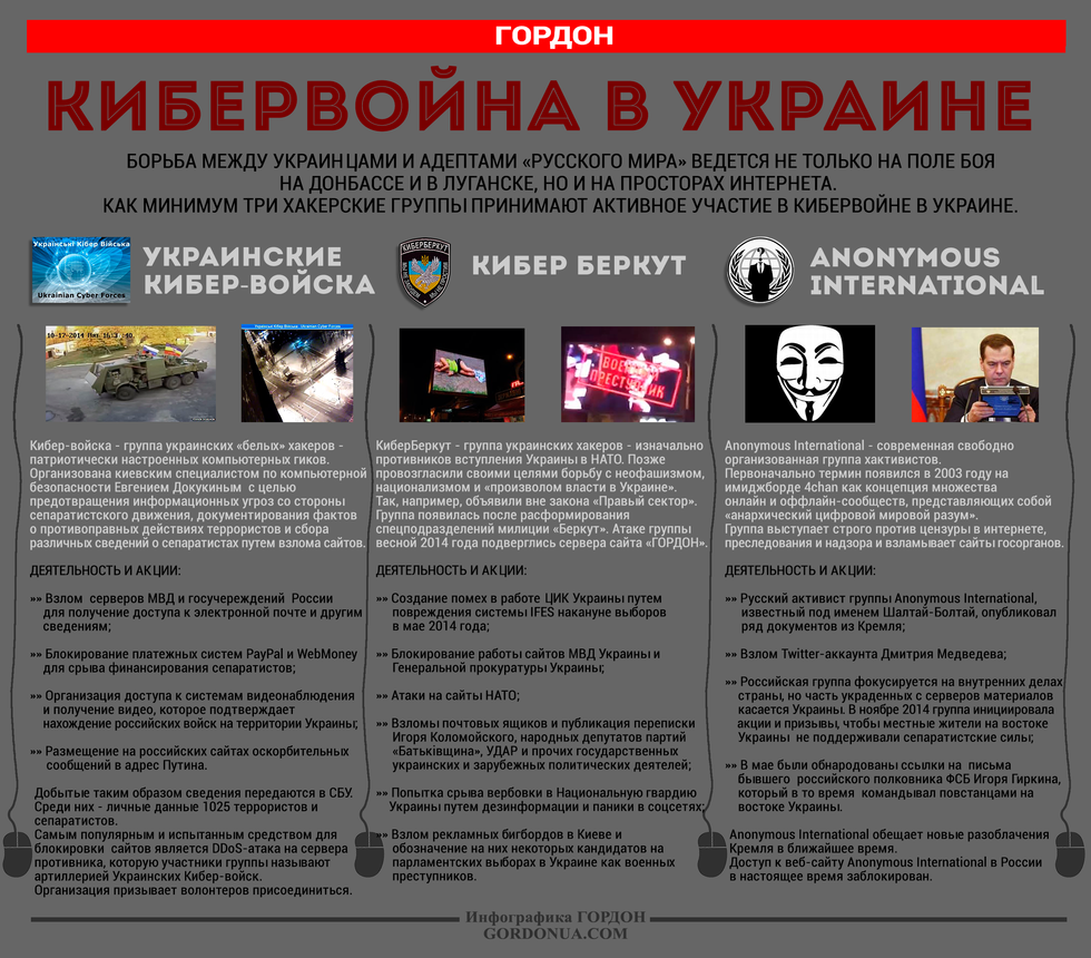 Пока военные ценой жизни и здоровья держат рубежи на востоке Украины в реальных боях, на просторах интернета идет своя война – кибер-войска и "хактивисты" с обеих сторон атакуют сайты госорганов, сливают конфиденциальную информацию, сеют панику и влияют на мнение и выбор населения через виртуальные сети.