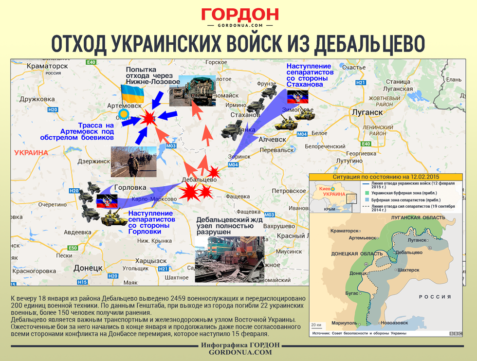 Утром 18 февраля украинские военные начали отход из Дебальцево, которое является важным транспортным и железнодорожным узлом в регионе. Силы АТО передислоцируются в Артемовск, находящийся в 50 км западнее. Как военные ВСУ, Нацгвардии и добровольческих батальонов отходили из дебальцевской петли, и откуда атаковали их боевики ДНР и ЛНР, смотрите в инфографике "ГОРДОН".