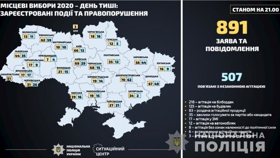 По состоянию на 21.00 24 октября полицейские в Украине получили 891 заявление и сообщение о нарушениях в день тишины перед местными выборами, когда запрещена любая агитация, проинформировала пресс-служба Нацполиции. Большинство сообщений связаны с незаконной агитацией. Правоохранители открыли 29 уголовных производств, в том числе по фактам препятствования работе избирательной комиссии и реализации избирательного права, подкупа избирателей, краж, подделки печатей, умышленного повреждения или порчи имущества, хулиганства. Также правоохранители составили 109 административных протоколов о нарушении избирательного законодательства.