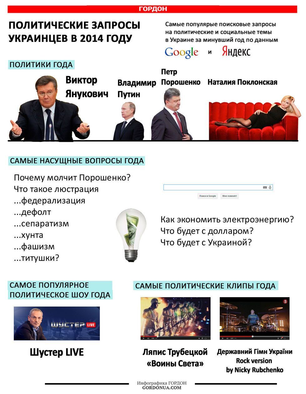 Больше всего в 2014 году украинцы искали в интернете скоропостижно покинувшего страну экс-президента Виктора Януковича, интересовались, почему молчит Порошенко и смотрели Шустер LIVE. Читайте подробнее: Ярош, Фриске, рецепт коктейля Молотова, бронежилеты и почему вода мокрая – что украинцы искали в Google в 2014 году.