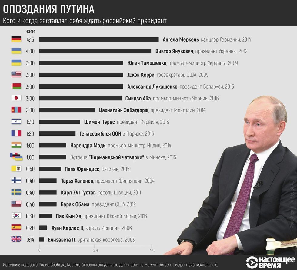 Президент РФ Владимир Путин опоздал на встречу с премьер-министром Японии Синдзо Абэ, которая состоялась 15 декабря, на три часа. Издание "Настоящее время" (проект "Радио Свобода") в связи с этим подготовило инфографику об опозданиях российского президента за последние 13 лет.