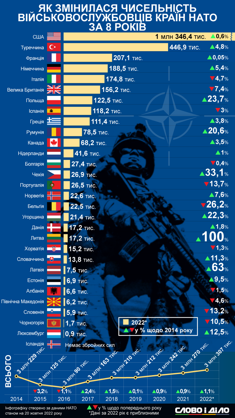 С 2014 года, когда Россия начала вооруженную агрессию против Украины, общая численность военнослужащих в странах НАТО почти не изменилась – около 3,3 млн, – но в 18 странах Альянса она выросла. Инфографику об этом разместило 20 октября издание "Слово и дело". Наибольший рост зафиксирован в Литве (на 100%) и Латвии (на 63%), а самую большую армию имеют США (1,35 млн военнослужащих). В то же время за восемь лет численность вооруженных сил уменьшилась в 11 странах – членах НАТО.