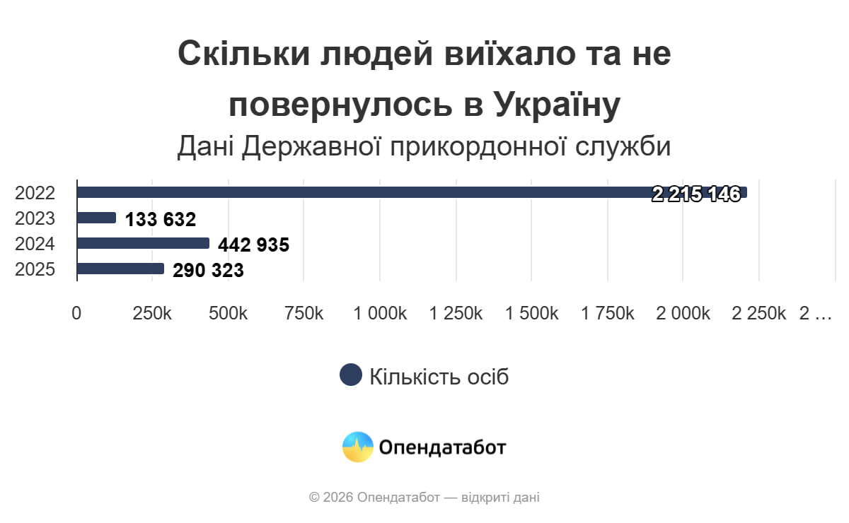 В 2025 году выехали за границу и не вернулись обратно 290,3 тыс. украинцев – почти в полтора раза меньше, чем в 2024 году. Об этом 22 января сообщил проект Opendatabot со ссылкой на данные Государственной пограничной службы Украины.