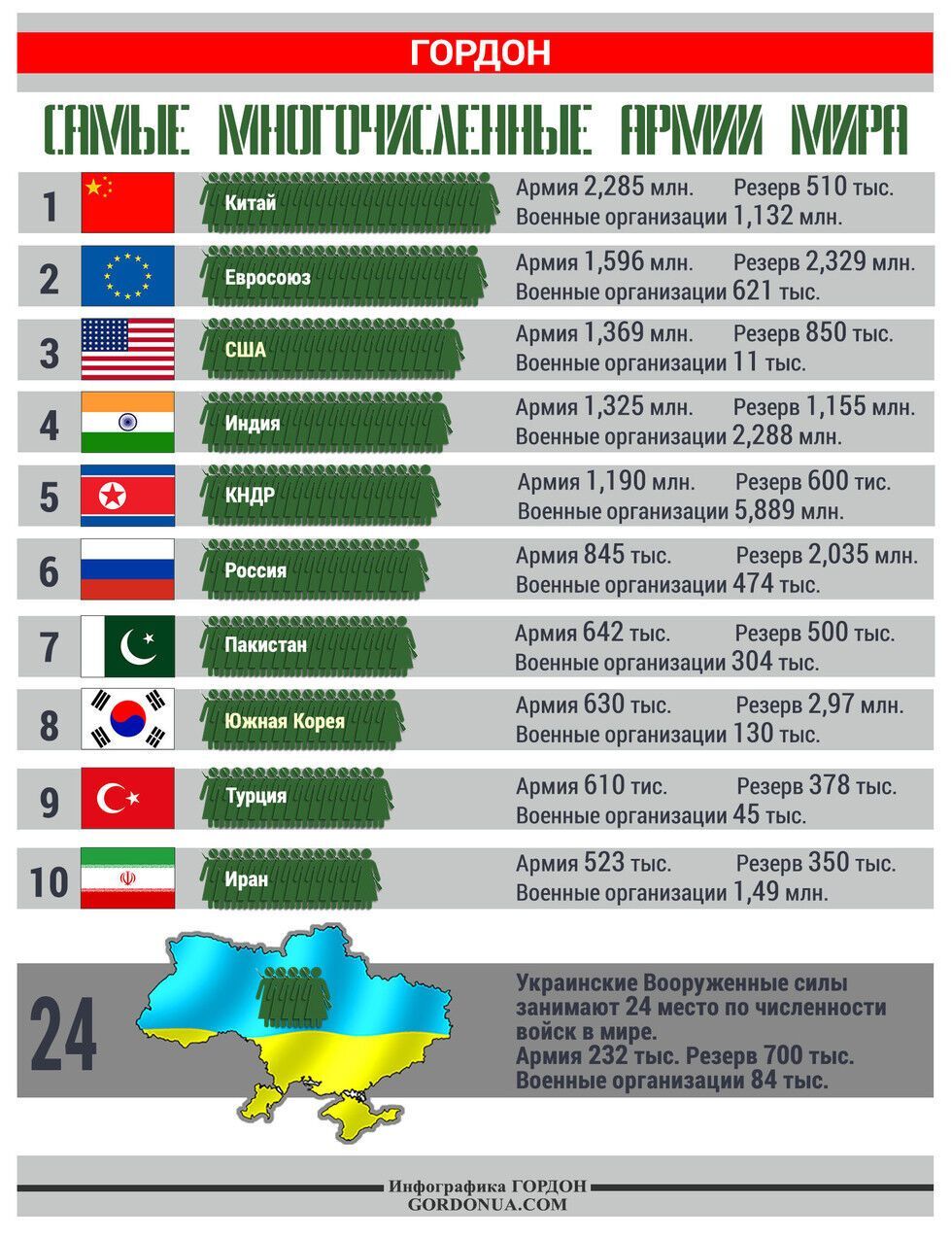 Украина занимает 24 место в мире по размеру и мощи своей армии. До лидеров "гонки вооружений" стране далеко. Смотрите в инфографике "ГОРДОН", какое из государств обладает самыми многочисленными военными силами.