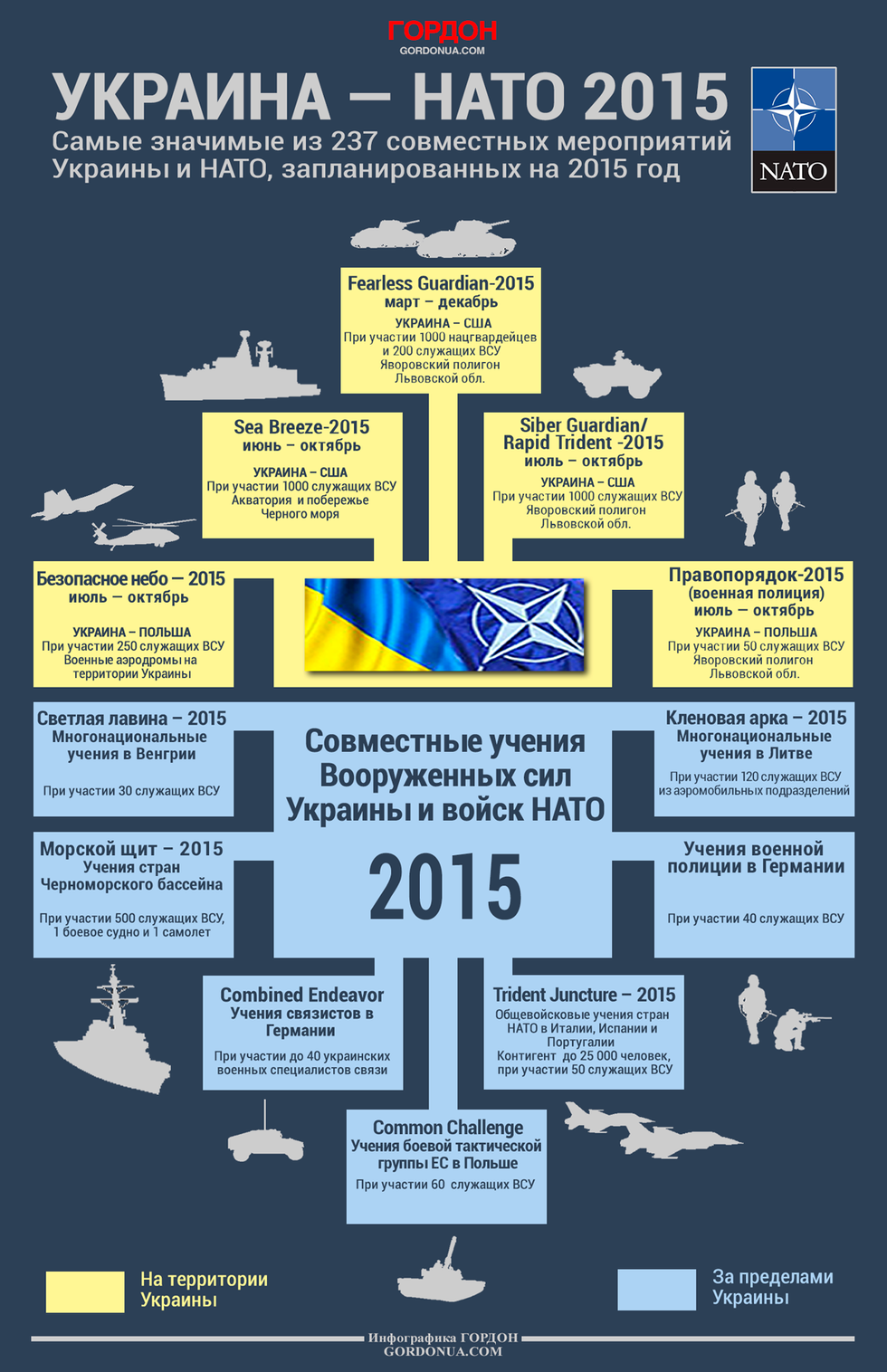 В текущем году в общей сложности запланированы 237 различных мероприятий при совместном участии Украины и НАТО. "ГОРДОН" выбрал самые значимые из них. Подробнее об украино-натовских планах читайте: Украина — НАТО: План сотрудничества на 2015 год.