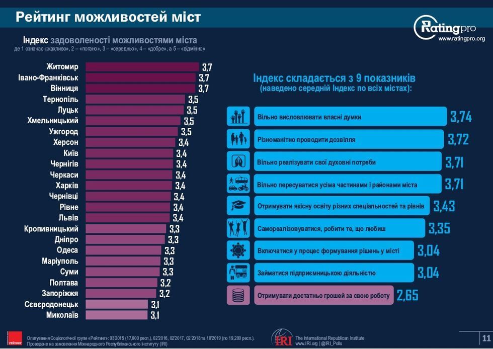 Лучшими городами по уровню возможностей и свобод стали Житомир, Ивано-Франковск и Винница. Киев занял 9-е место в топе. Об этом сообщает Социологическая группа "Рейтинг". Города оценивали по таким параметрам: возможность свободно выражать свои мысли, разнообразно проводить досуг, получать качественное образование, включаться в процесс формирования решений в городе, самореализовываться, свободно передвигаться по всем районам города, реализовывать свои духовные потребности, заниматься предпринимательской деятельностью и получать достаточно денег за свою работу. Опрос проводился с 6 сентября по 10 октября. Было опрошено 19,2 тыс. респондентов по всей Украине, кроме временно оккупированных территорий. Статистическая погрешность для каждого города не превышает 3,5%.
